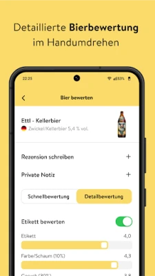 Die innovative Scan-Funktion von BeerTasting ermöglicht es Ihnen, mit einem einfachen Foto das Etikett Ihrer Flasche zu erfassen und umgehend umfassende Informationen zum Bier abzurufen. Ob Pils, IPA, Stout oder eine seltene Spezialität – BeerTasting liefert Ihnen Details zu Brauerei, Stil, Alkoholgehalt sowie Bewertungen anderer Nutzer, damit Sie stets die perfekte Wahl treffen. Halten Sie Ihre Eindrücke fest, indem Sie Biere bewerten, persönliche Notizen hinzufügen oder ausführliche Rezensionen für die globale BeerTasting-Gemeinschaft verfassen. Ihr individuelles Biertagebuch wächst so mit jeder Verkostung und bietet Ihnen jederzeit einen Überblick über Ihre Favoriten, während Ihre Beiträge gleichzeitig anderen BeerTastern wertvolle Orientierung bieten.