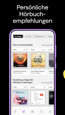Mit BookBeat tauchst du ein in über eine Million Hörbücher und E-Books auf deinem Android-Gerät. Genieße uneingeschränkten Zugang mit einem flexiblen Abonnement – höre und lies, wann und wo immer du willst.