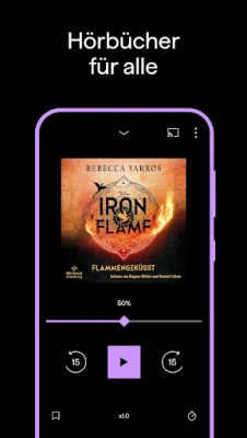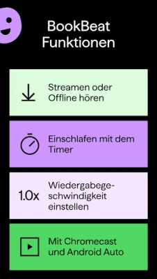 BookBeat bereichert Ihr Hörerlebnis mit intelligenten Funktionen: Setzen Sie individuelle Lesezeichen und Notizen, um besondere Momente festzuhalten, nutzen Sie den integrierten Timer für entspanntes Einschlafen und passen Sie die Wiedergabegeschwindigkeit sowie Spulintervalle an Ihre Vorlieben an. Genießen Sie die nahtlose Synchronisation auf all Ihren Geräten, verfolgen Sie Ihre persönlichen Hörgewohnheiten mit der Statistikfunktion und teilen Sie Ihre Fortschritte mit Freund*innen. BookBeat ist umfassend kompatibel mit Smartphones, Tablets, Chromecast, Android Auto, Chromebook und bietet sogar Dark Mode sowie umfassende Bedienungshilfen.