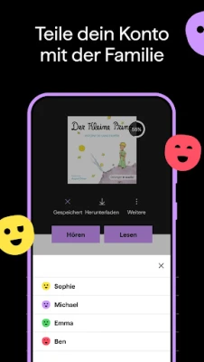 Das gemeinsame Hörvergnügen ist mit BookBeat mühelos und persönlich. Teilen Sie Ihr Konto innerhalb der Familie und schaffen Sie individuelle Profile für bis zu fünf Personen, jede mit eigenen Empfehlungen und persönlichen Listen. Spezielle Kinderprofile passen die Inhalte auf die jüngsten Ohren an und sorgen für eine altersgerechte Unterhaltung. BookBeat zeichnet sich durch inspirierende Hörbuchtipps und kuratierte Sammlungen aus, die Ihnen immer wieder neue Welten eröffnen und das Stöbern zu einem echten Erlebnis machen.