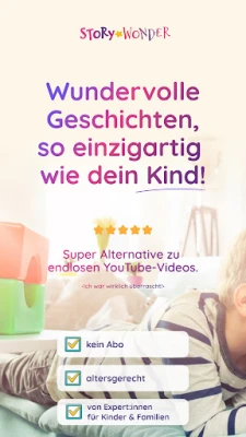 Willkommen bei StoryWonder, der einzigartigen Erlebniswelt, die Kinder zu den strahlenden Protagonisten ihrer ganz persönlichen Erzählungen macht! Tauchen Sie ein in eine magische Bibliothek, wo jede Geschichte ein maßgeschneidertes Abenteuer ist, kreiert speziell für Ihr Kind im Alter von 0 bis 10 Jahren. Ob zum Selberlesen, gemeinsamen Vorlesen oder als fesselndes Hörbuch mit professionellen Stimmen – StoryWonder verwandelt alltägliche Momente in unvergessliche Erinnerungen und stärkt dabei die Familienbindung.